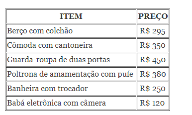 Obviamente, se você quiser um ambiente luxuoso, os custos serão mais altos. Abaixo, listamos uma média de preços para os principais componentes de um quarto de bebê, pesquisados no site Mercado Livre.